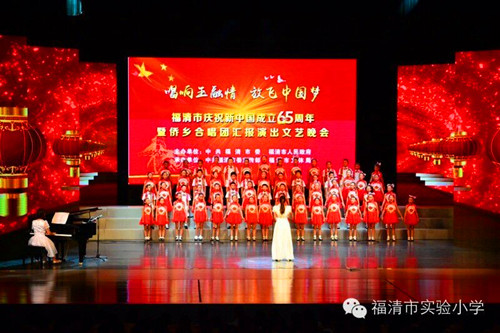 为庆祝新中国成立65周年,9月30日晚,由中共福清市委、福清市人民政府主办,中共福清市委宣传部、福清市文体局承办的“唱响玉融情·放飞中国梦”国庆文艺晚会在市文化艺术中心隆重举行,省委领导和市四套班子领导出席并观看了演出。福清市实验小学“福桑花合唱团”先后演唱了《吃光饼》、《牧马之歌》两首歌,队员们仿佛是一个个可爱的小精灵,清脆、透亮的声音萦绕在耳畔,那圆润的歌声再次飘荡在市文化中心,赢得了阵阵喝彩,其中富有地方特色的歌曲《吃光饼》更是将现场的气氛推向了高潮。